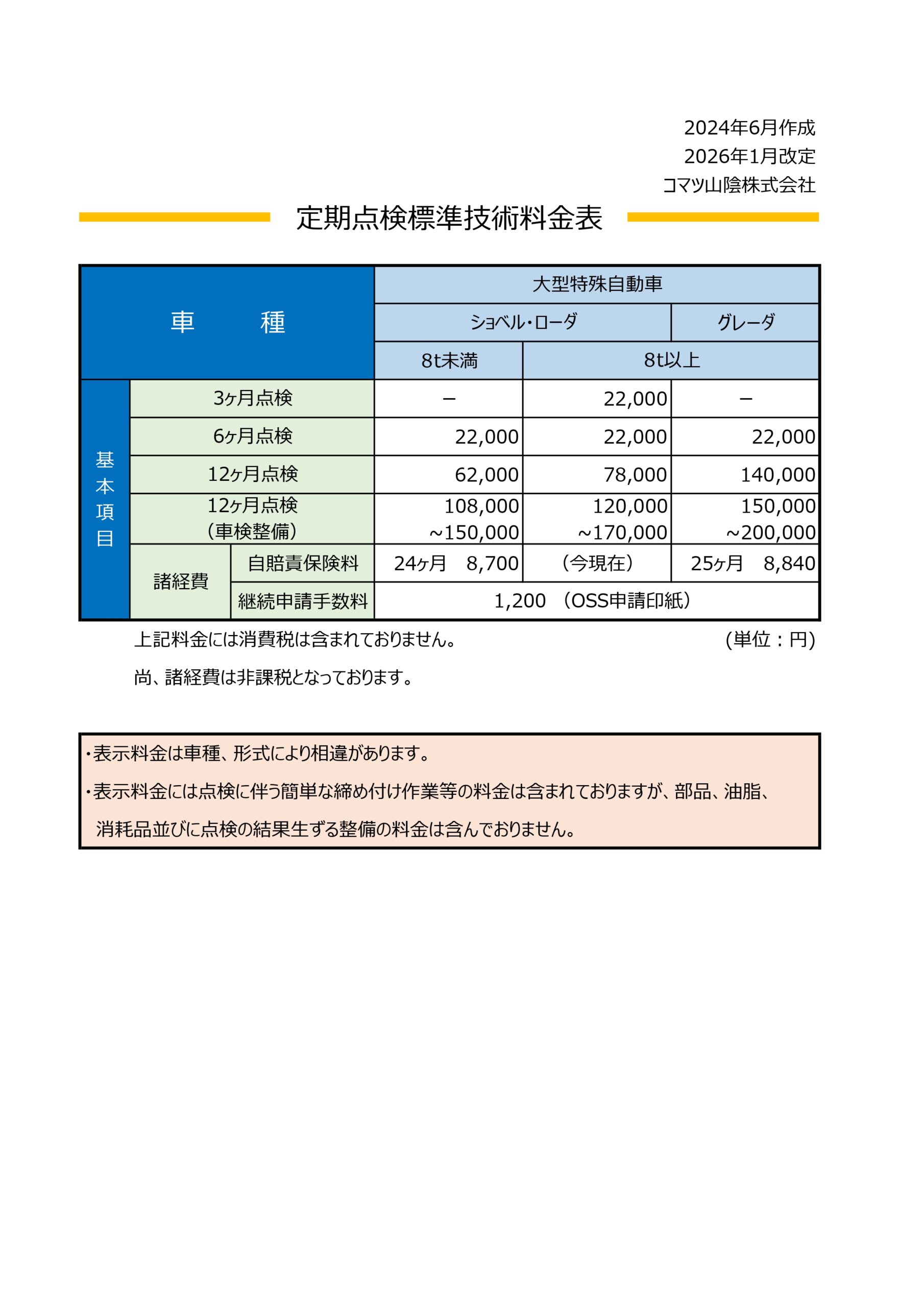 平素は格別のご高配を賜り、厚く御礼申し上げます。この度、2026年1月1日付で定期点検標準技術料金表を改定いたしました。何卒ご理解賜りますよう、よろしくお願い申し上げます。